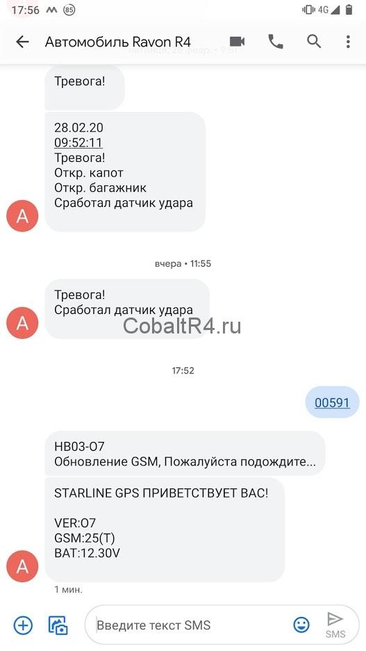 Для обновления отправляем SMS-команду 00591 на номер сим-карты, установленной в сигнализации. Перед этим предварительно не забываем снять автомобиль с охраны и открыть дверь (на случай включенной защиты от случайных нажатий брелка).